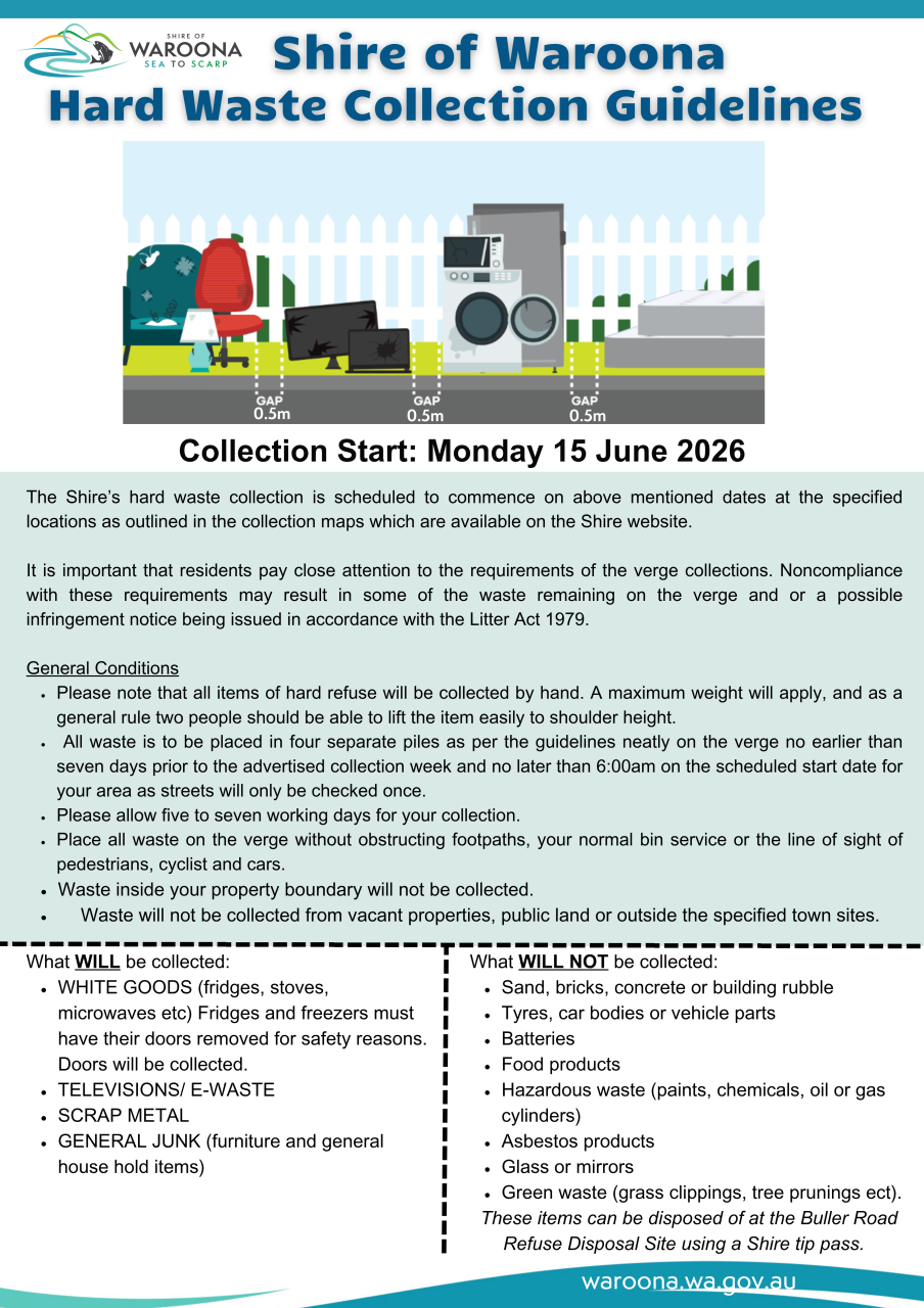 The Shire of Waroona’s hard waste collection will be taking place in the 2025/26 financial year.