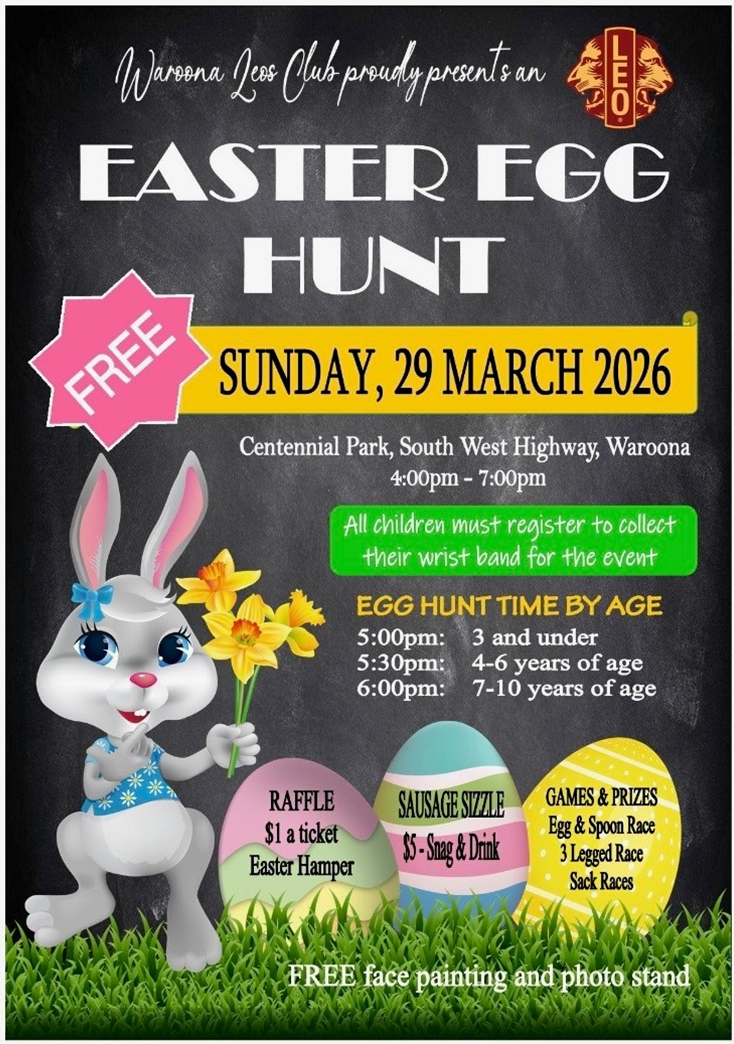 The Waroona Lions and Leos Club proudly presents a FREE Easter Egg Hunt.