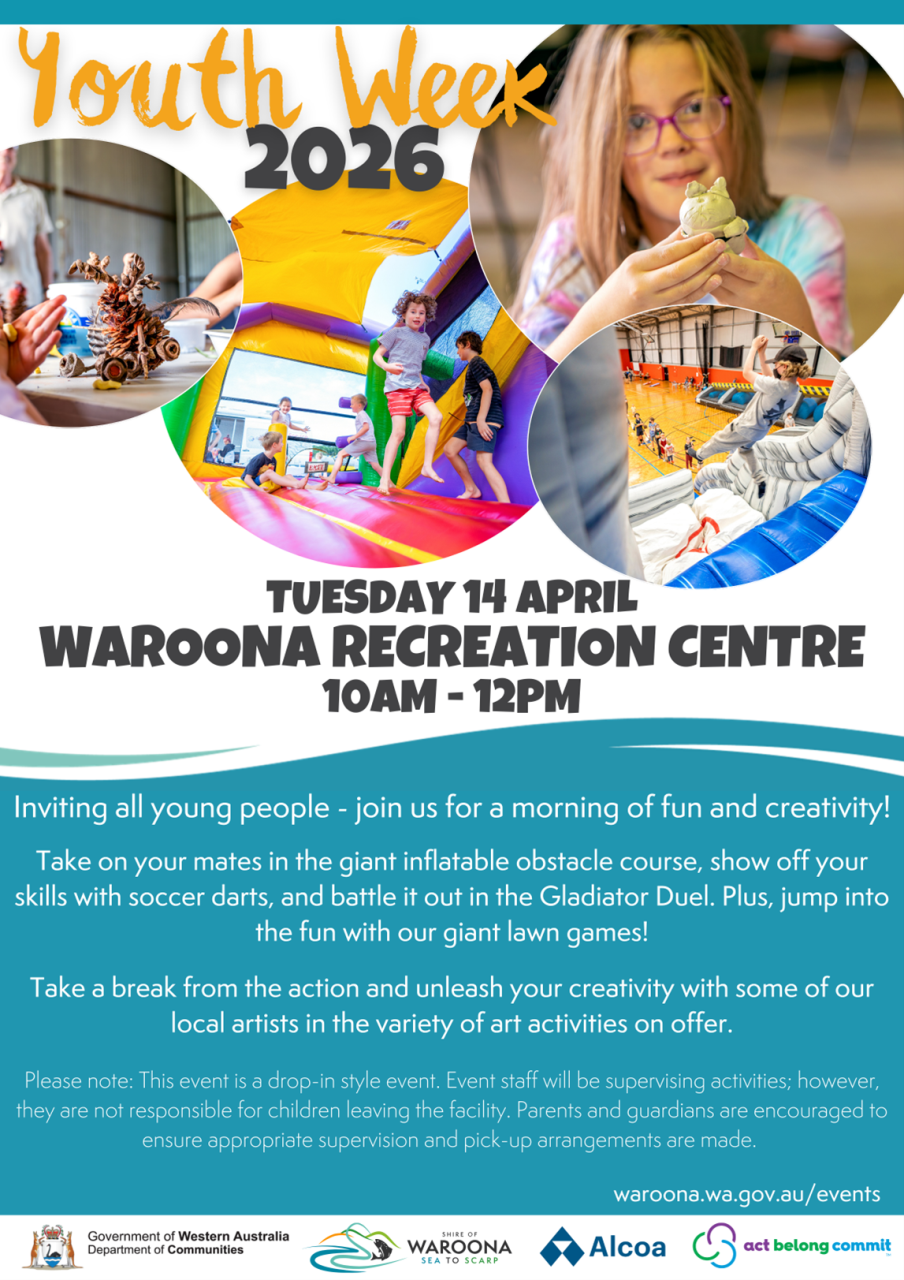 Join us for a free morning of fun and creativity! Youth Week activities have been made possible with the support of Department of Communities and Alcoa of Australia.