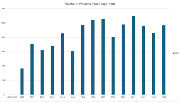 There is a rainfall gauge at the Dam. Since 2010 rainfall shows generally increasing annual rainfall until 2018. Since then it has roughly levelled off.
