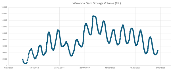 The graph below shows how the Dam volumes have gone up and down, winter to pre-rain autumn each year since 2010. As of 24 November 2025 there was 6,410 Ml in the Dam, which is approximately 42% full. The Dam was last full in 2018 at its capacity of 15,260 Ml.